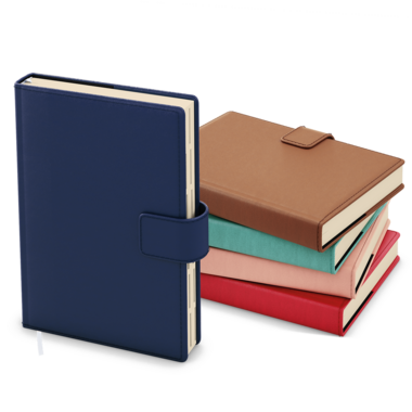 jemný matný materiál, ražba, oboustranná pěnová výplň desek, obšití v barvě potahu, magnetická přezka, poutko na tužku, 3 vnitřní kapsy, šitá vazba V8, kapitálky, stužka, perforované rožky, papírová manžeta