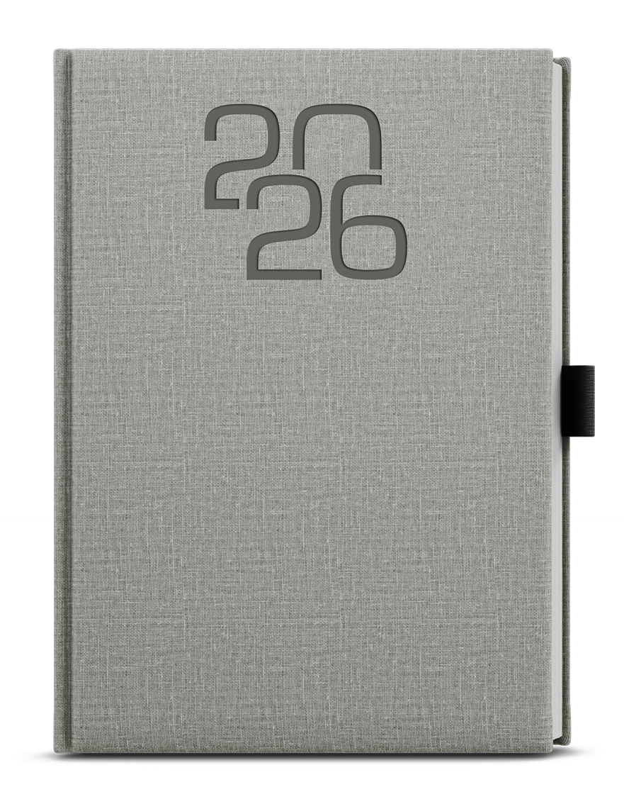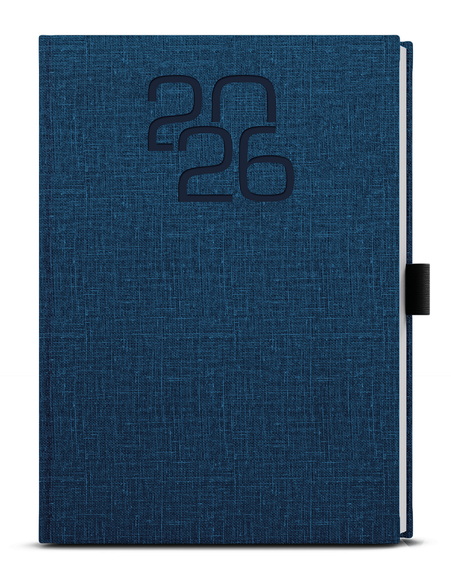 strukturovaný materiál, ražba roku, jednostranná pěnová výplň desek, šitá vazba V8, poutko na tužku, stužka, kapitálky, perforované rožky, mapa ČR a SR, vlepená kapsa, ofset, 70g/m2