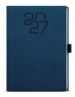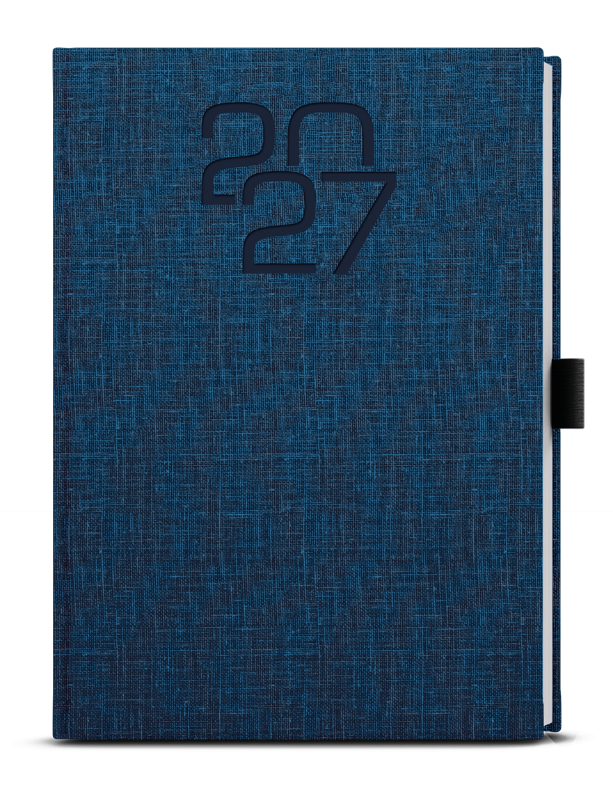 Týdenní diář modré barvy formátu A5 vyrobený ze zajímavého materiálu s moderní ražbou roku a poutkem na tužku.