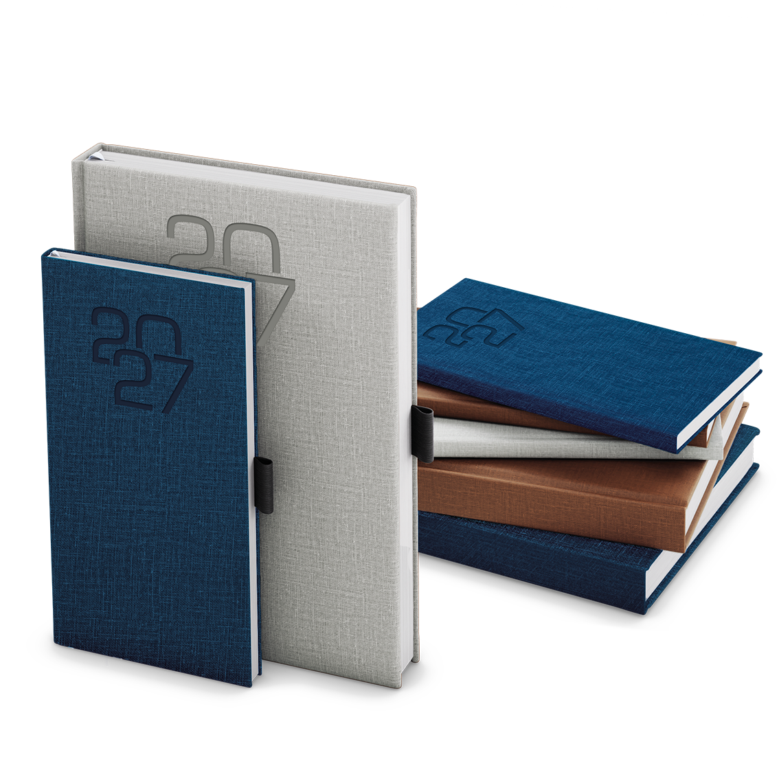 strukturovaný materiál, ražba roku, jednostranná pěnová výplň desek, šitá vazba V8, poutko na tužku, stužka, kapitálky, perforované rožky, mapa ČR a SR, vlepená kapsa // ofset, 70g/m2