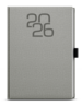 Týdenní diář šedé barvy formátu A5 vyrobený ze zajímavého materiálu s moderní ražbou roku a poutkem na tužku.