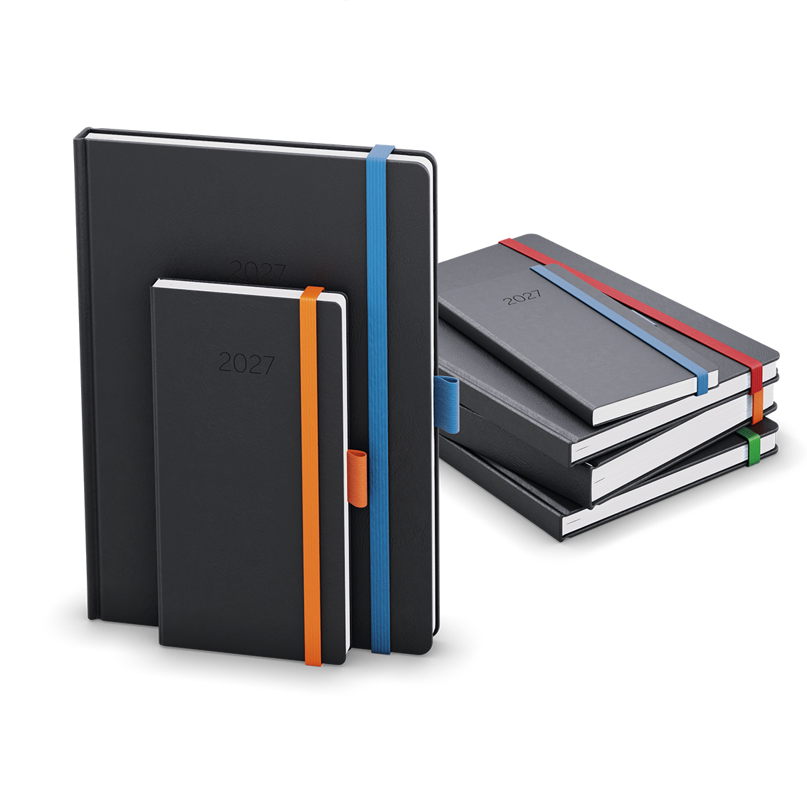 V8, pololesklý, jemně strukturovaný materiál, ražba roku, gumička a poutko, stužka, kapitálky, perforované rožky, mapa ČR a SR, vlepená kapsa, kulaté rohy // ofset, 70g/m2