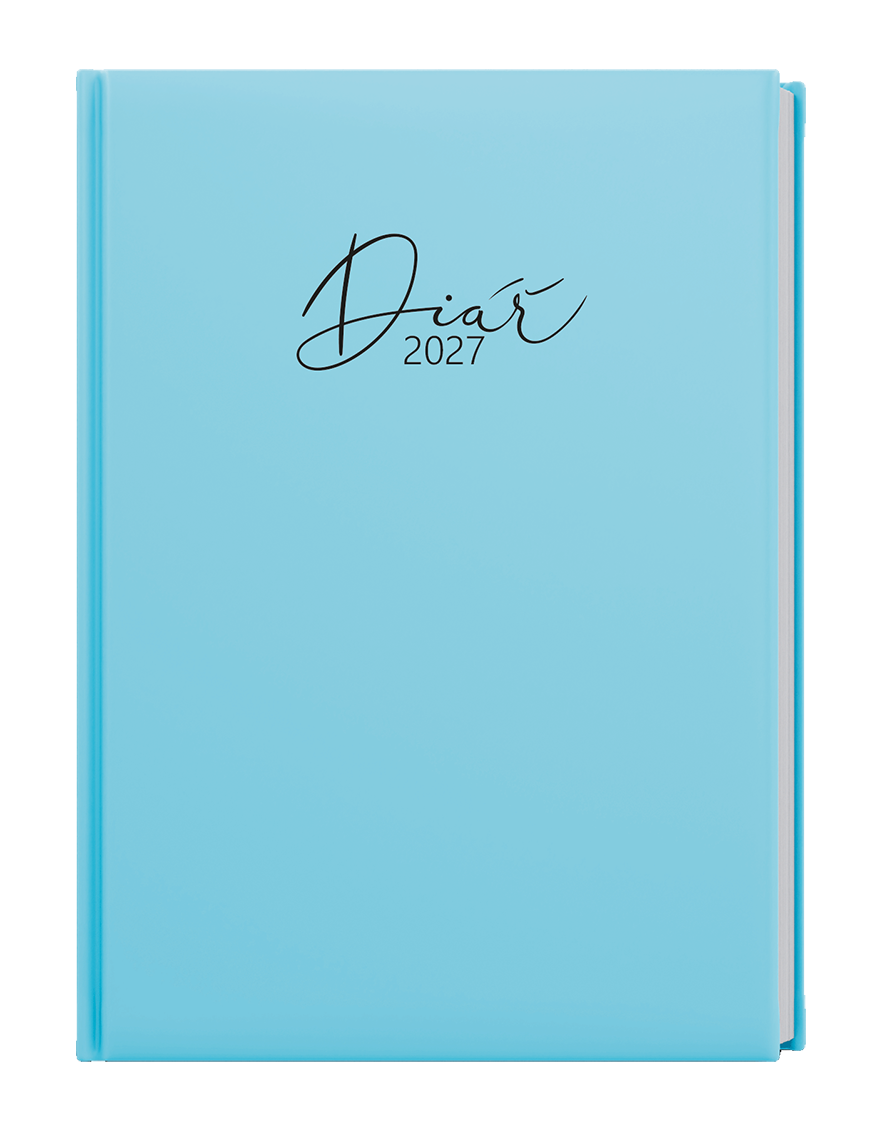 Týdenní diář v nepoškrabatelném laminu s parciálním lakem v pastelově modré barvě. Je vyráběný ve formátu A5, má velký prostor pro poznámky a plánování.