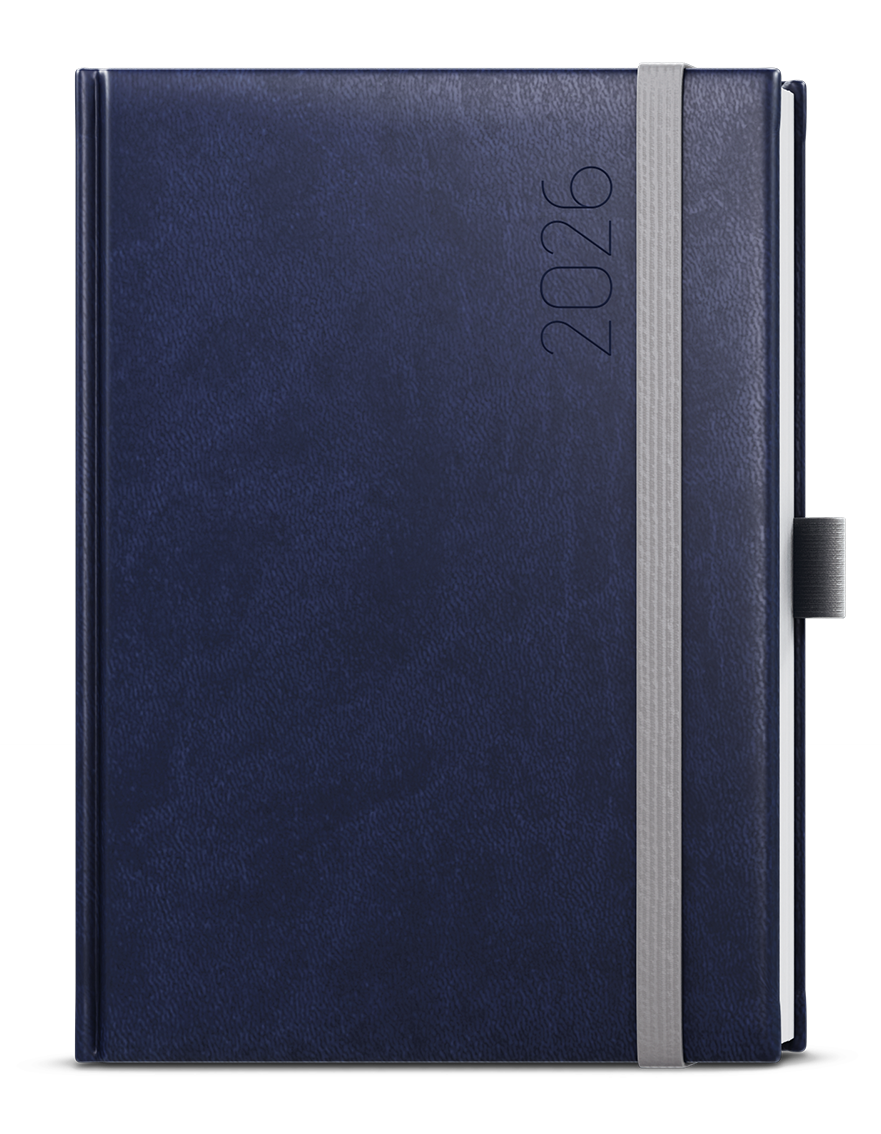 jemný hladký materiál, ražba roku, jednostranná pěnová výplň desek, šitá vazba V8, stužka, kapitálky, perforované rožky, mapa ČR a SR, vlepená kapsa, gumička a poutko, ofset, 70g/m2
