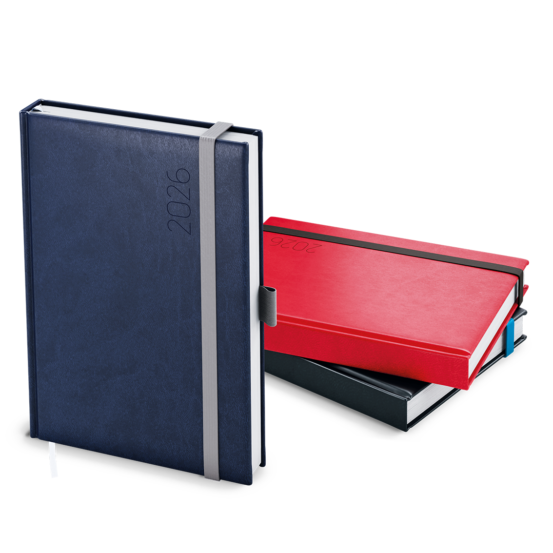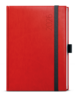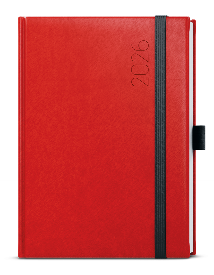 Týdenní diář v červené barvě z jemné vivelly ve formátu A5 s praktickou gumičkou a poutkem na propisku. Má velký prostor pro poznámky a plánování.