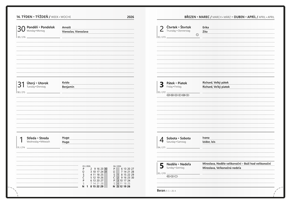 strukturovaný materiál s lesklým povrchem, ražba roku, jednostranná pěnová výplň desek, šitá vazba V8, stužka, perforované rožky, vlepená kapsa, ofset, 70g/m2
