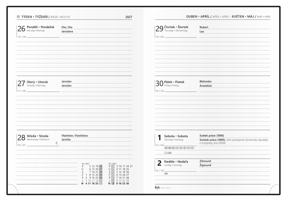 jemný hladký materiál, celoplošná ražba motivu včetně ražby roku, šitá vazba V8, stužka, gumička, poutko na propisku, perforované rožky, vlepená kapsa // ofset, 70g/m2