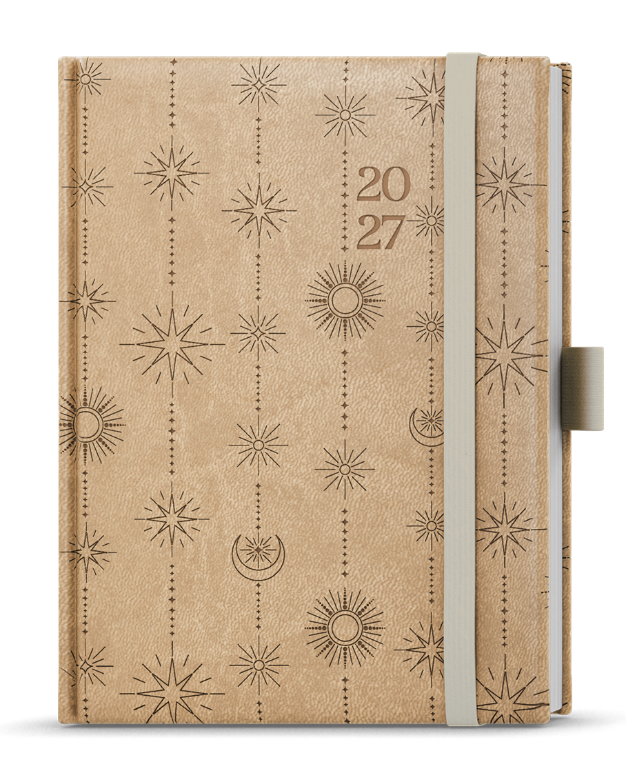 jemný hladký materiál, celoplošná ražba motivu včetně ražby roku, šitá vazba V8, stužka, gumička, poutko na propisku, perforované rožky, vlepená kapsa // ofset, 70g/m2