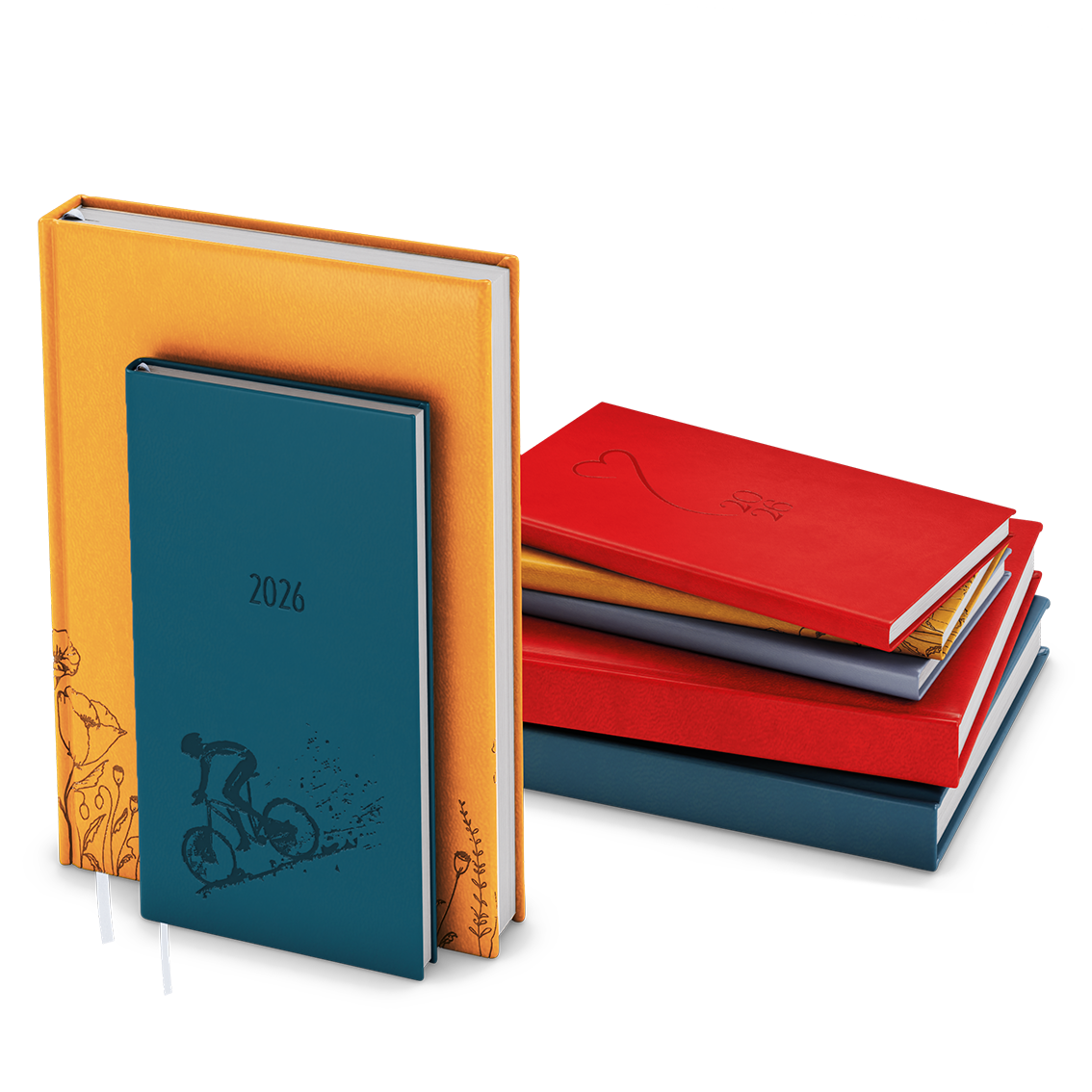 jemný hladký materiál, ražba motivu a roku, šitá vazba V8, stužka, perforované rožky, vlepená kapsa, ofset, 70g/m2