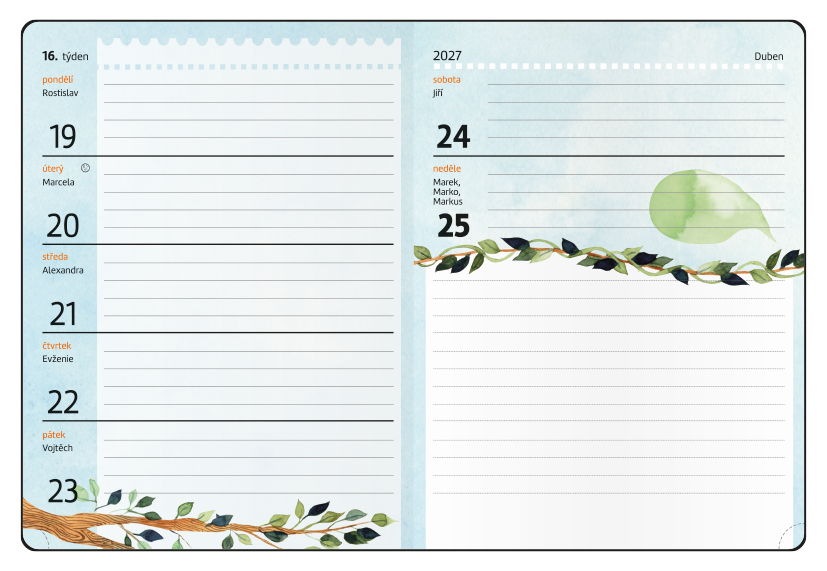 tištěná grafika potažená nepoškrabatelným matným laminem s parciálním lakem, šitá vazba V8, stužka, perforované rožky, kulaté rohy // ofset, 80g/m2