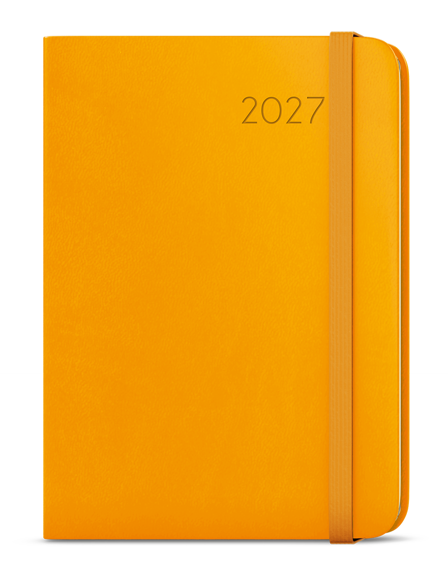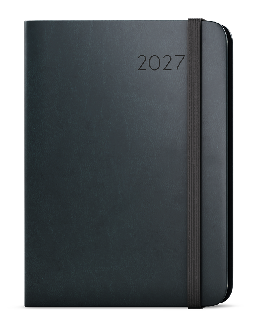 jemný hladký materiál, ražba roku, kulaté rožky, vazba V5 - flexovazba, kapitálky, perforované rožky, vlepená kapsa, stužka a gumička // ofset, 70g/m2, bílý papír, kulaté rožky