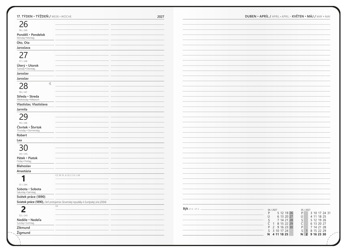 Diář s týdenním kalendáriem na jedné straně a na druhé straně s prostorem na poznámky. Desky jsou vyrobeny ze strukturovaného lesklého materiálu s jednostrannou pěnovou výplní a s kulatými rohy.