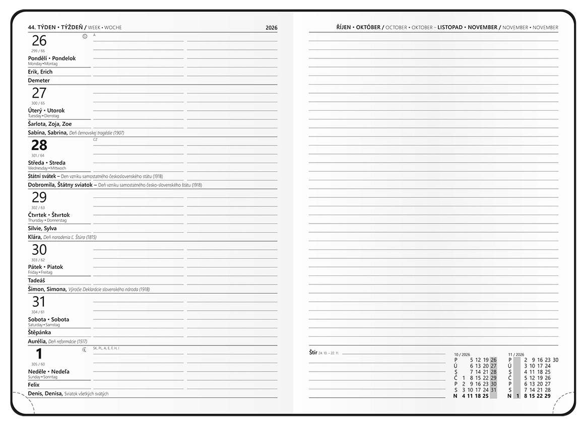 jemný hladký materiál, ražba roku, jednostranná pěnová výplň desek, šitá vazba V8, stužka, kapitálky, perforované rožky, mapa ČR a SR, vlepená kapsa, kulaté rohyofset, 70g/m2, bílý papír, kulaté rožky